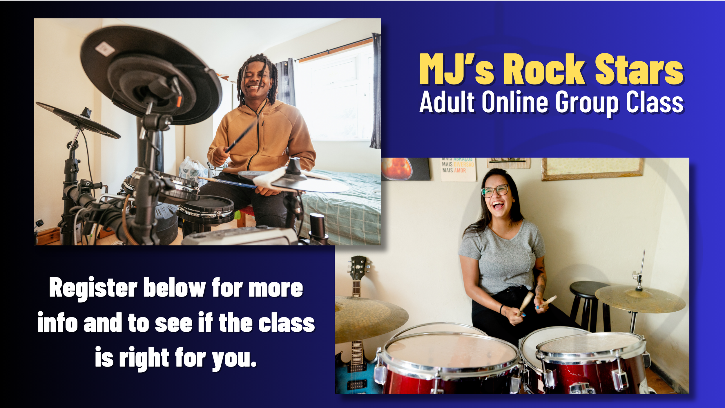 Pursue your lifelong dream of drumming with weekly lessons and group encouragement for only $49 monthly membership fee.